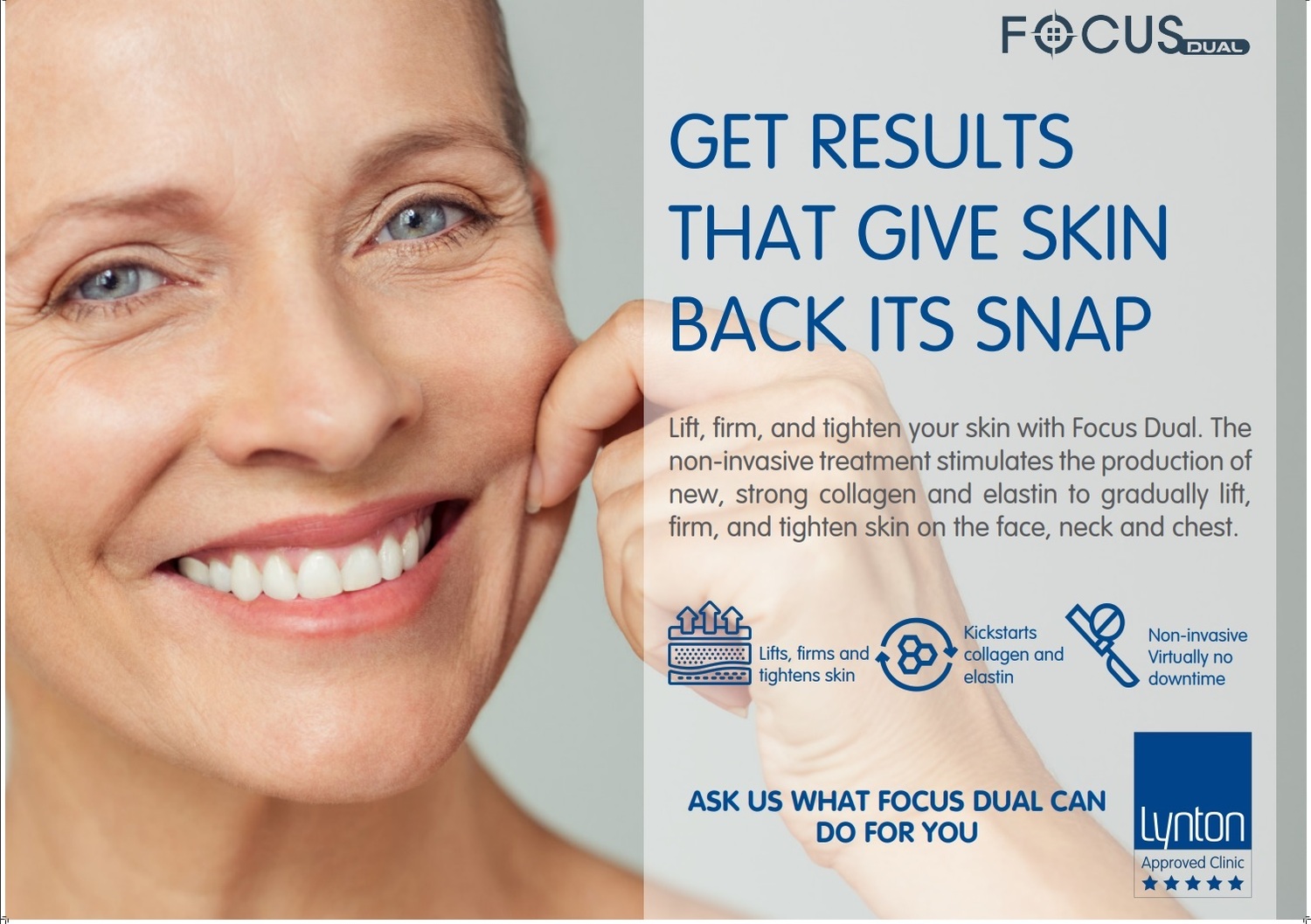 Secondly the Focus Dual Microneedling device uses vacuum suction technology to allow the deep penetration of radio frequency energy into the dermis layer of the skin. Radio frequency heats the skin to 55 degrees causing dermal contraction and stimulating the production of collagen and elastin. These proteins help to regenerate the skin and improve its elasticity.